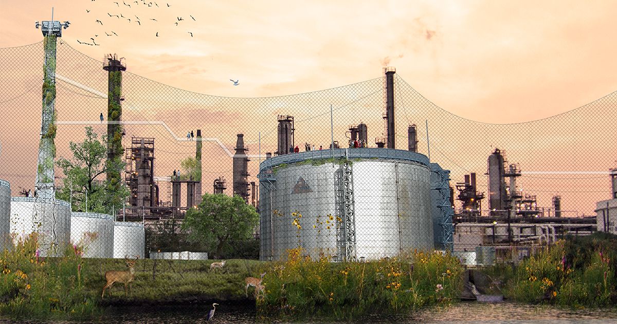 Each structure in the petrochemical complex was evacuated of its residual compounds and cleaned. Bio-remediating plants were spliced with engineered rapid growth genetic doppelgängers cultivated by A&M’s college of agriculture and life sciences. Their success at quickly cleaning the Valero site was widely chronicled and used as a standard for regenerative landscape design. Since the site was located directly adjacent to the ship channel the city requirements asked for proposals that would be flexible for future development. The result was a microclimate park that began to thrive faster than even the scientists expected. Thick ropes were anchored to the bottom of the ship channel and stretched like a porous skin over the cleaned infrastructure. It formed a web that was large enough for small animals, water, and insects to pass through but narrow enough that humans were precluded from entering.